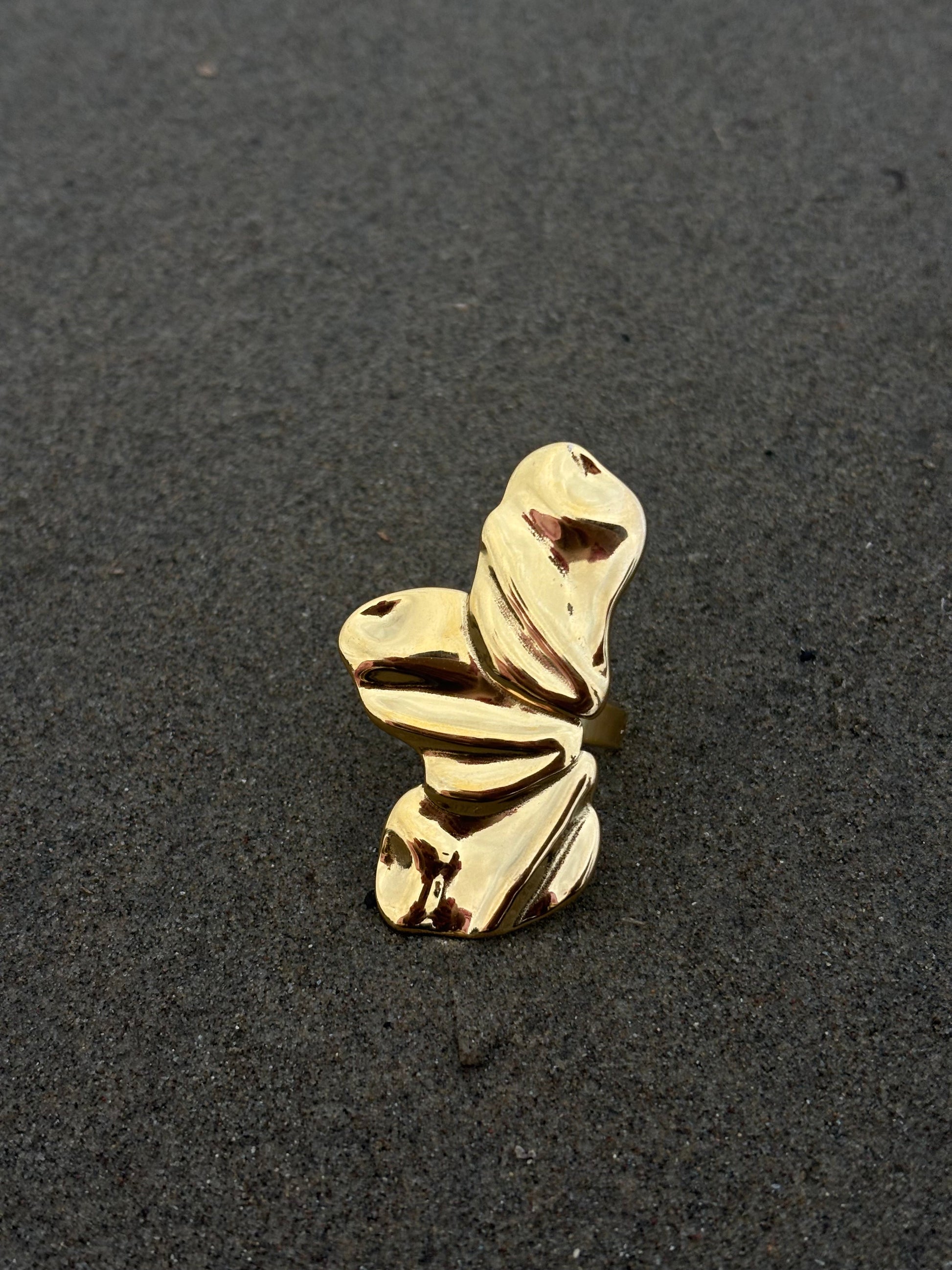 Flowing like liquid gold, the Molten Wave Ring is an ode to organic beauty and modern artistry. Its fluid, textured design reflects light from every angle, creating a soft yet striking glow. Adjustable for comfort, this piece blends sculptural elegance with everyday wearability.